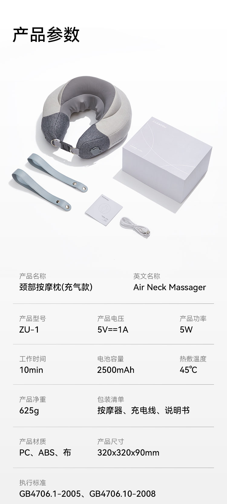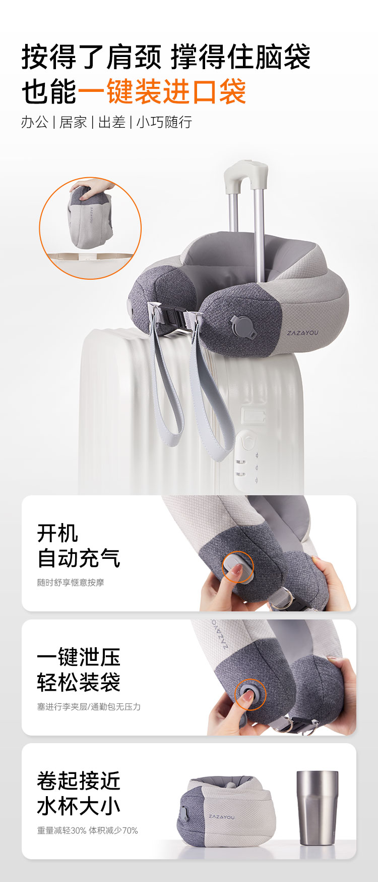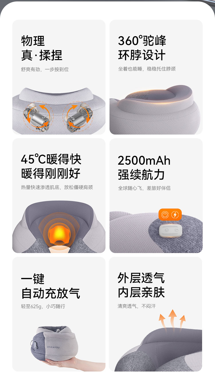 1、一键充放气,轻至625g,出差商旅轻巧便携,随时享受按摩;