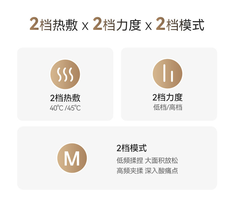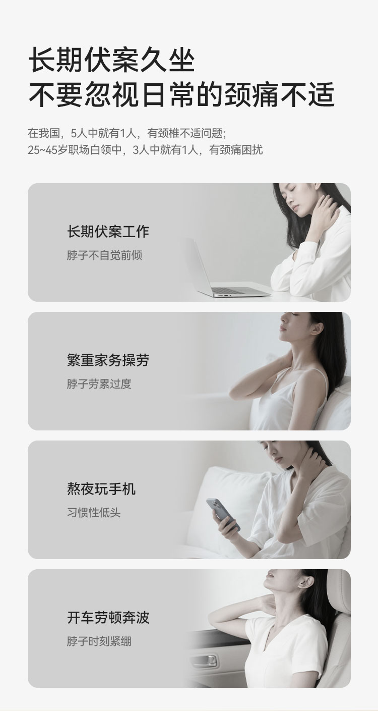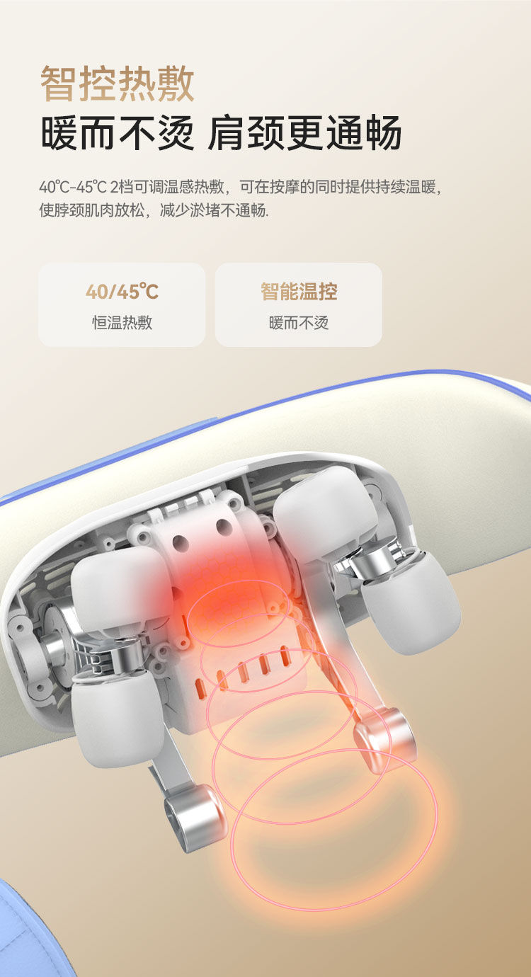 4、40-45°C,2档温感热敷,热敷放松配合深度揉捏,更舒爽,缓解颈部酸痛不适;