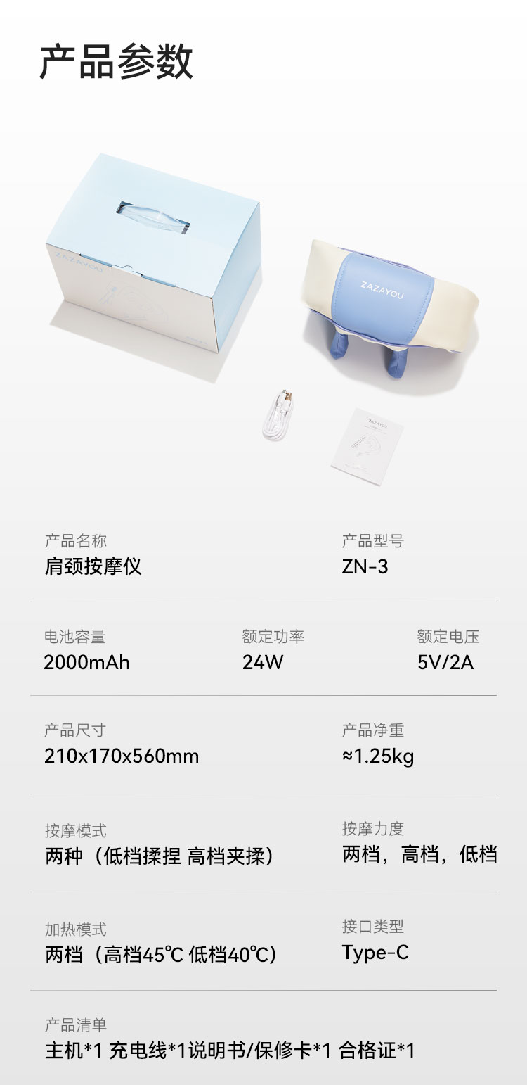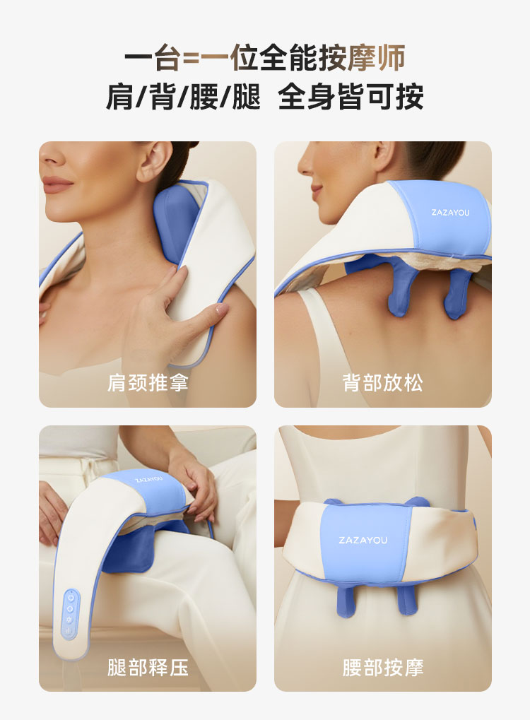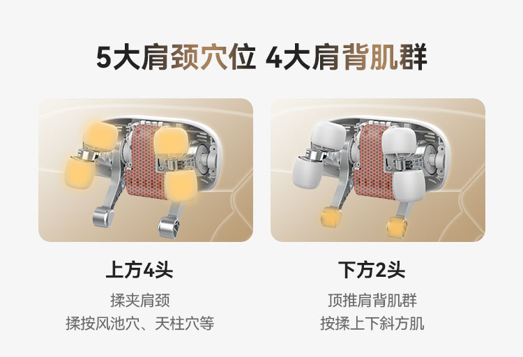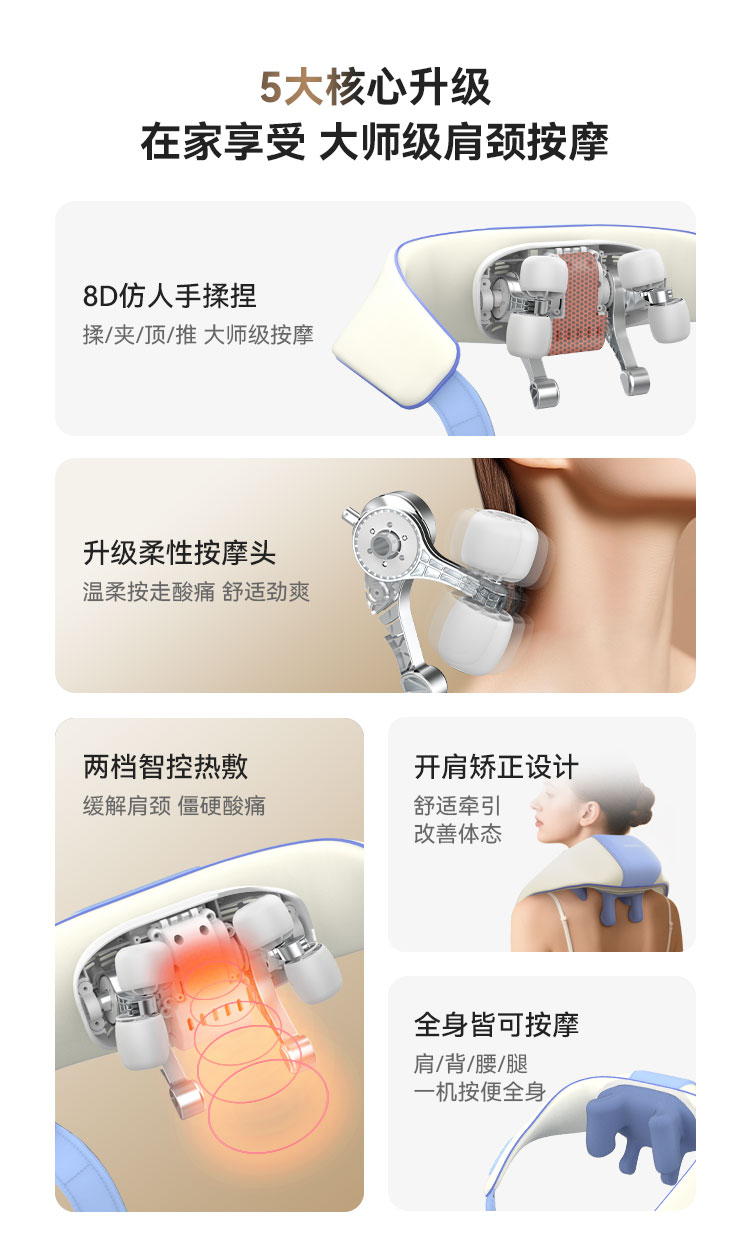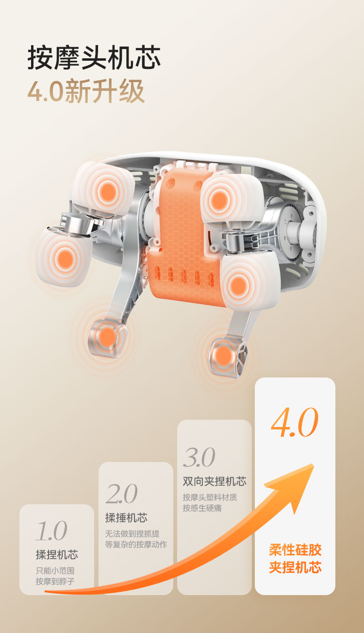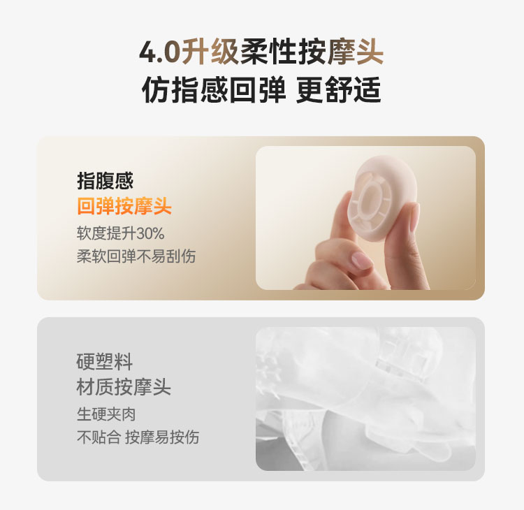 1、加大加宽硅胶按摩头,大按摩触点,颈肩4D揉捏按一体;