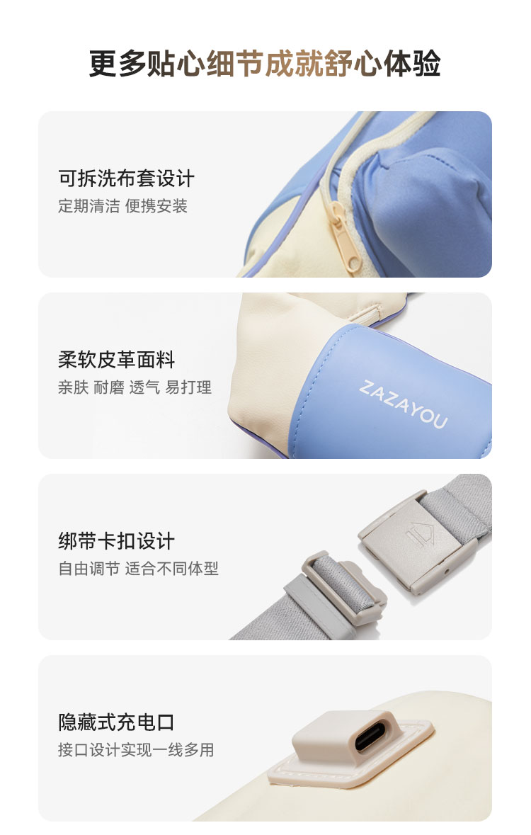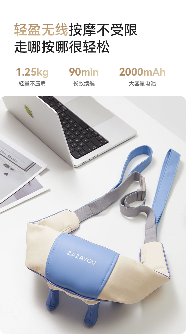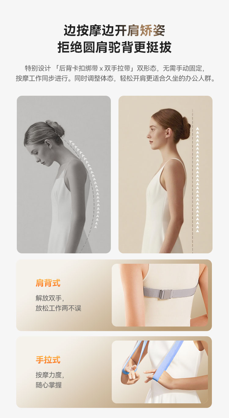 3、肩背式设计,解放双手,可边按摩边工作/娱乐;拉手式设计,按摩力度自由把控;
